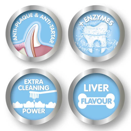 Combines two enzymes which fight plaque, bacteria and tartar build-up. Fluoride-free and readily accepted by puppies due to its delicious liver flavour.