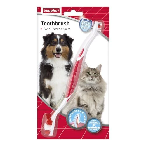 The Beaphar Double-Ended Toothbrush for Dogs and Cats, when used in combination with Beaphar Toothpaste, provides an ideal way to protect your dog or cat’s teeth. Early plaque formation must be brushed away in order to prevent bad breath and tooth decay. The handy soft grip makes sure the brush does not slip through your hands when brushing. The brush is specially designed to suit the shape of your dog’s or cat’s teeth. Varied-length bristles help you to reach all the teeth, even in difficult to reach places in your pets mouth.