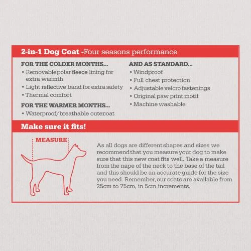 The Danish Design 2 in 1 dog coat is a convertible coat that, can be used in either cold or warm weather conditions. During winter, the polar fleece liner can be attached to the coat with easy fit Velcro strips. When it is warmer, the fleece can be removed and the dog coat converts into a light raincoat. You can be assured that your dog will have full chest protection with this coat and protection on a night with light reflective beading and light reflective fastening strap. The waist strap is also built in to help prevent side slippage and give your dog a snug fit. The exterior of the coat is made from fabric that is waterproof, wind-proof and breathable and ensures your dog is comfortable in any weather.