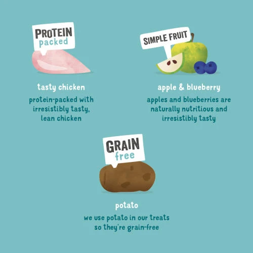 Edgard & Cooper make these grain-free bites using an irresistible combination of protein-rich chicken and naturally nutritious apple and blueberry. Gently baked, these pocket-sized bites are packed with tasty goodness. What’s more (like all our treats), they’re carefully packed in a 100% biodegradable bag.