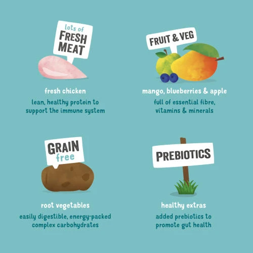 Fresh chicken 41%, potatoes, peas, pea protein, chicken fat, linseed, chicken gravy, minerals, fish oil, mannan-oligosaccharides (MOS), fructo-oligosaccharides (FOS), mango 0.04%, blueberries 0.04%, apple 0.04%, strawberries 0.04%, carrots 0.04%, tomatoes 0.04%, marigold blossoms, nettle, blackberry leaves, fennel, caraway, chamomile, balm.