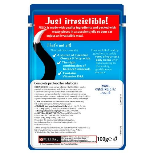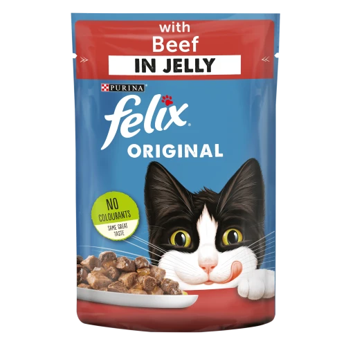 Felix Beef in Jelly Pouches are delicious meals made with quality ingredients and packed with beef pieces in a scrumptious jelly. Containing essential Omega 6 fatty acids, the right combination of balanced minerals, and vitamins D & E.