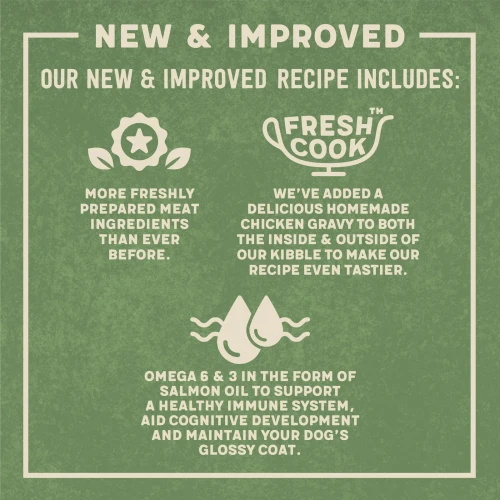 Chicken and Meat Meals 26% (Dried Chicken 6.5%*), Barley, Maize, Rice (14%), Oats (4%), Freshly Prepared Chicken (4%), Beet Pulp, Salmon Oil (1%), Poultry Fat, Minerals, Poultry Gravy (0.5%), Seaweed (0.1%), FOS (0.1%), Glucosamine (0.05%), Chondroitin (0.01%), Yucca Extract (0.01%)