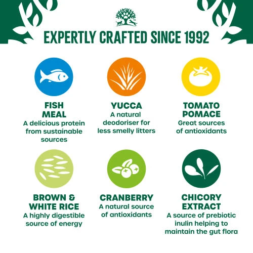 Fish meal* (24%), white rice, brown rice, olive oil, pea protein, potato protein, fish stock (5.1%), fish oil (5%), maize gluten, tomato pomace, potassium chloride, chicory extract (0.25%), calcium carbonate, carrot, sodium chloride, cranberry extract (0.05%), yucca extract (0.02%), rosemary extract (0.007%), green tea extract (0.004%), pomegranate extract (0.001%). *Sustainably sourced, predominantly ocean white fish.