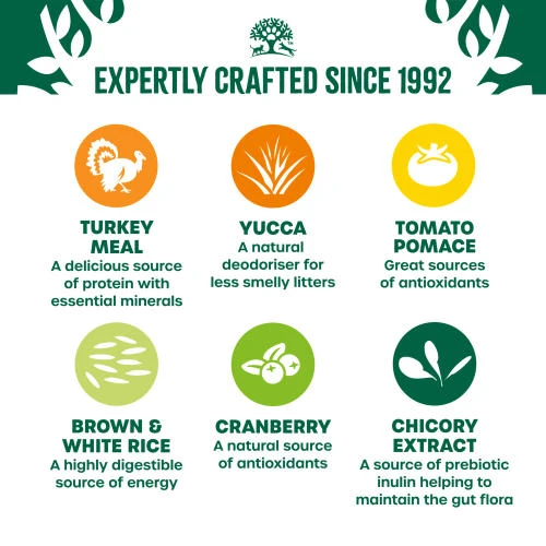 Cats can suffer from food allergies, giving rise to poor skin and coat condition as well as stomach problems. The most common allergens are milk, beef, and wheat. So, unlike most other brands James Wellbeloved cat foods do not contains any of these problem ingredients. And because turkey is an uncommon protein source, it’s great for a hypo-allergenic diet.