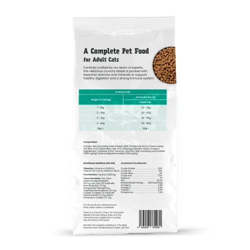 Carefully crafted by our team of experts, Monster Pet Foods Chicken with Rice Dry Adult Cat Food is the paw-fect nutritionally complete pet food for adult cats.