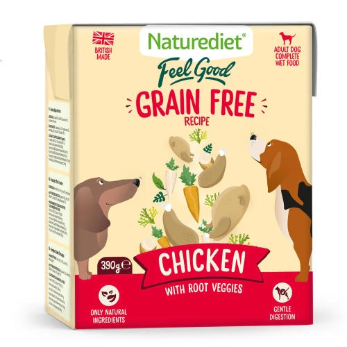 Naturediet Feel Good Grain-free Chicken Adult Wet Dog Food Cartons are a grain free recipe made with chicken and root veggies. Gently steam cooked to retain goodness!