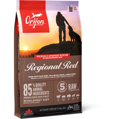 ORIJEN Regional Red diet is packed with 85%* quality animal ingredients like raw** beef, wild boar, bison, lamb and pork. Packed with WholePrey animal ingredients like organs and bone, ORIJEN food is made with the most nutrient-dense, succulent parts of the prey to deliver the nutrition dogs need. The result is a diet for your canine companion that is beyond comparison.