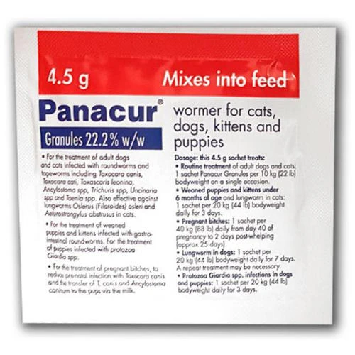Panacur granules are a broad-spectrum anthelmintic for the treatment of pet dogs and cats, ideal for treating immature and mature stages of roundworms, tapeworms and lungworms of the gastro-intestinal and respiratory tracts. Virtually tasteless and can be mixed with a small treat, or mixed in with food.