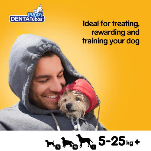 Pedigree DentaTubos Puppy Treats have been specially created for little mouths. Puppies love to chew, but its important for them not to chew anything too hard, that could damage their teeth. Pedigree Puppy DentaTubos dental chew sticks have a unique shape and texture specially designed to be kind to developing teeth and gums.