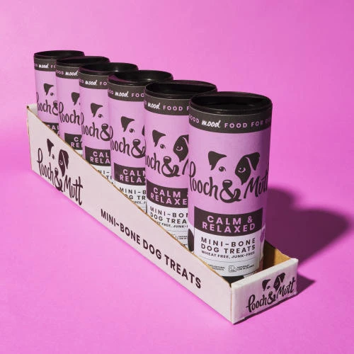 Pooch & Mutt Calm & Relaxed Dog Treats are delicious, hand-baked mini bones made with lamb, chamomile and l-tryptophan as natural aids to a sleepy pooch.