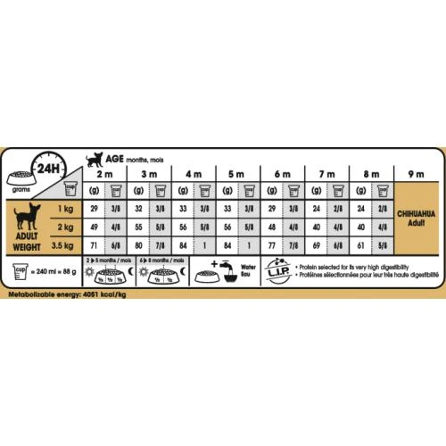 Immune system support – Growth is an essential stage in your dog’s life: it is the time of big changes, discoveries and new encounters. During this key period, the puppy’s immune system develops gradually. CHIHUAHUA PUPPY helps support your puppy’s natural defences thanks particularly to a patented* complex of antioxidants includingvitamin E. *France, patent No EP1146870.High palatability – CHIHUAHUA PUPPY satisfies the Chihuahua’s appetite thanks to the combination of three factors: an adapted kibble size and shape, an exclusive formulation and selected flavours.Stool odour reduction – This formula helps reduce faecal smell and volume.