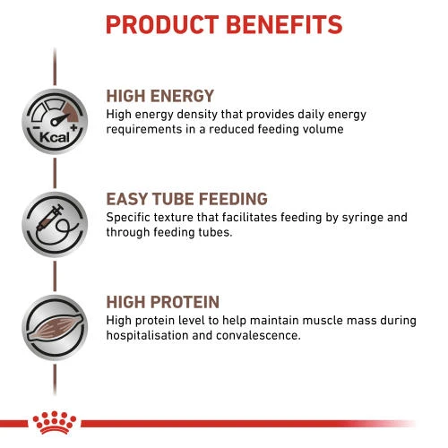 Thanks to its high energy density, this formula provides your cat or dog with their daily energy requirements in a reduced feeding volume. The ultra-soft texture of this highly digestible mousse facilitates easy tube or syringe feeding for your pet. ROYAL CANIN Recovery Mousse is specially formulated with a high protein content to help your dog or cat maintain a healthy muscle mass during hospitalisation and in periods of recovery. As part of the ROYAL CANIN Veterinary Range, it is important that this product is only given to your pet when recommended by a veterinary professional.