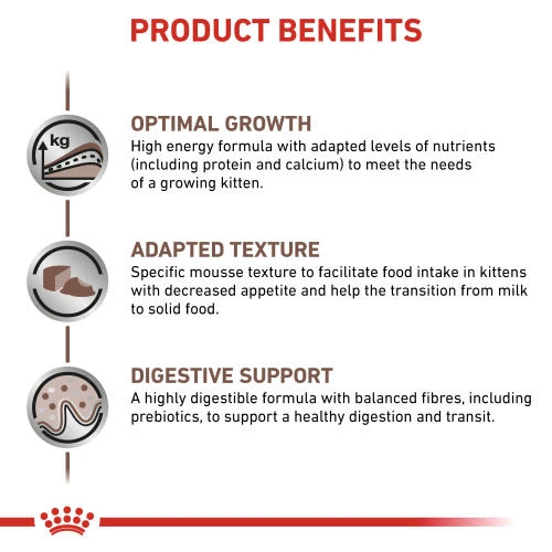 - Specific mousse texture to facilitate food intake in kittens with decreased appetite and help the transition from milk to solid food