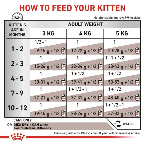 - High energy formula with adapted levels of nutrients (including protein and calcium) to meet the needs of a growing kitten