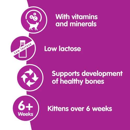 - Suitable for kittens over 6 weeks of age and it contains calcium, known to support a kitten’s rapid development and help support the growth of healthy teeth and bones