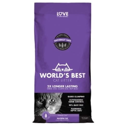 Worlds Best Cat Litter Multiple Cat Lavender Formula harnesses the power of naturally absorbent corn with natural lavender oil for cat owners who prefer their cat litter to be scented. Utilising the naturally absorbent corn, this formula delivers 2X longer lasting performance than the leading US litter brand. This naturally safe solution allows cat lovers like you to smell less, clean less and buy less.